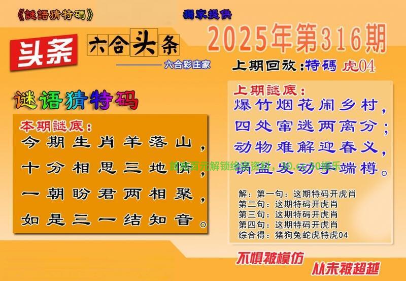 | 316期 今期生肖羊落山 十分相思三地情 一朝盼君两相聚 如是三一结知音 解译:今期生肖羊落山指羊,一朝盼君两相聚指朝肖羊兔龙马蛇猴 九肖:羊兔龙马蛇猴鸡狗鼠 六肖:羊兔龙马蛇猴 |